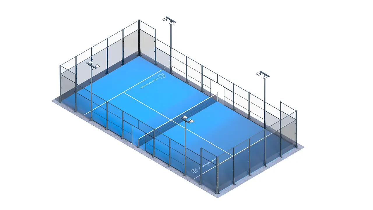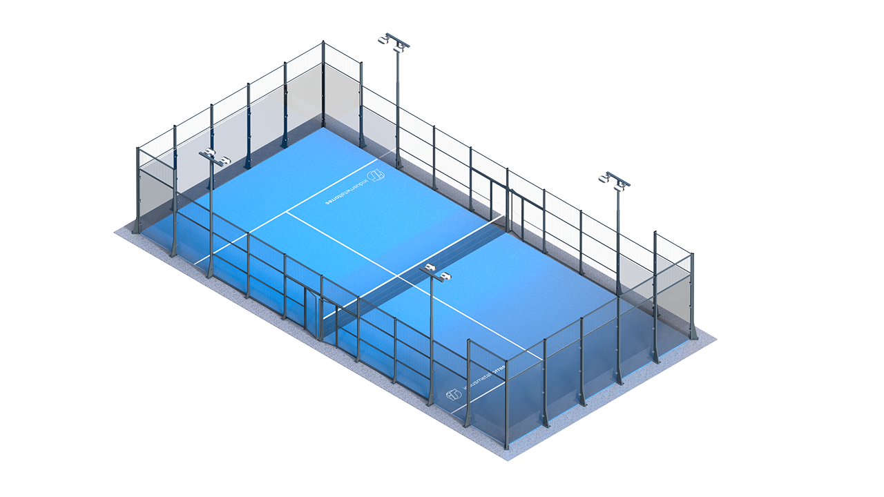 Indusmetal Torres dispose de tous les accessoires nécessaires pour installer tous nos modèles de terrains de padel, comme le gazon, le filet en nylon, les jeux de verre et les supports pour l'éclairage.