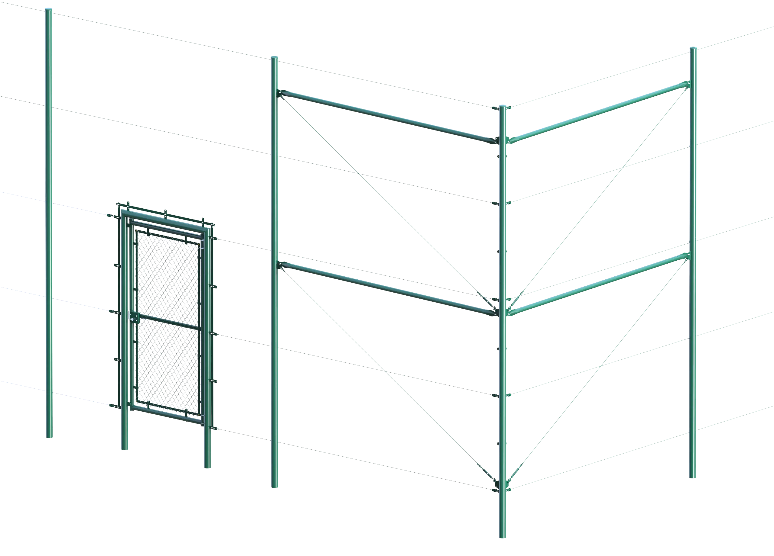 | FC.PT.10.0503.0400 | Kit poteau Ø 70 x 4.450 mm diviseur T gauche 4 Poteaux droits de Ø 70 x 4.450 mm avec accessoires soudés 6 platines départ de 2.000 x 22 x 4 mm 6 jambes de force doubles de Ø 48 x 2.835 mm 6 tendeurs pour cable en acier 4 mm 42 vis M-7 x 25 galvanisée |